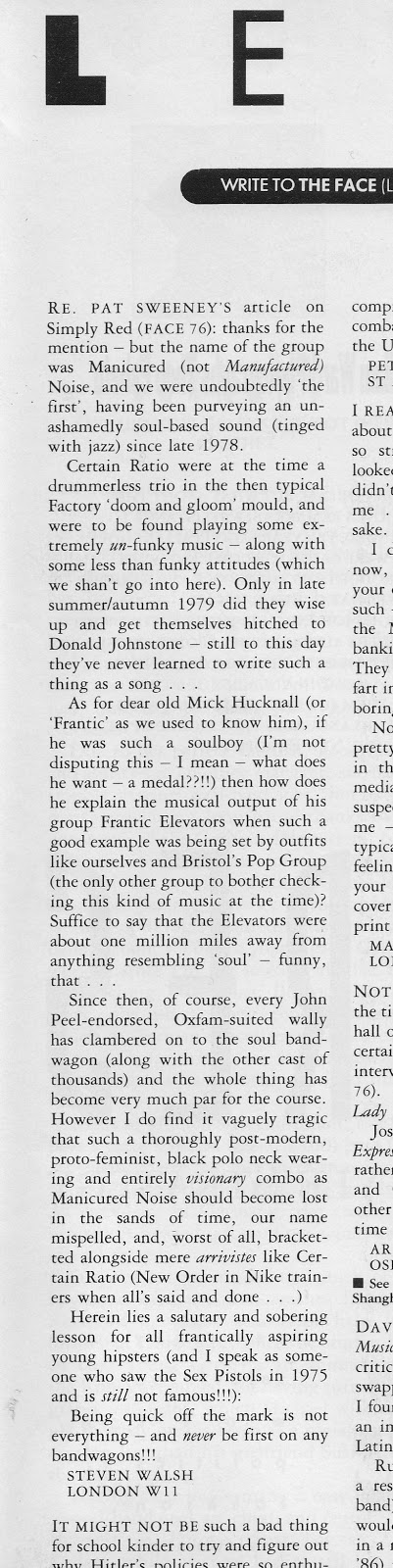 Two tiny things that caught my eye: a letter from Steve Walsh of Manicured Noise staking claim to have been the first punks to go funk (and amusingly derisive about A Certain Ratio's claims to same, although to fair to ACR, I think they admit they were into things like Hawkwind at the start, until the Damascene moment of seeing the Pop Group).